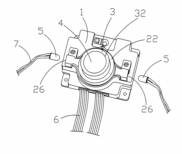 该散热风扇转速调整旋钮3是一圆柱形的壳体,其安装在该插灯件2的开口24中,该壳体中间开设有一个圆形的通孔32,该散热风扇转速调整旋钮3可以在相反的方向上旋转,向某一方向旋转时控制散热风扇转速加快,向相反方向旋转时控制散热风扇转速减慢。